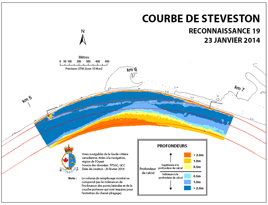 Les profondeurs cartographiées peuvent changer en raison de l'ensablement, du curage et du dragage. Pour obtenir des profondeurs plus récentes en zones draguées, veuillez consulter le site Web de la Garde Côtière Canadienne, AVADEPTH Water Depth Forecasting for the Fraser River (http://www2.pac.dfo-mpo.gc.ca)Note de bas de page 19.