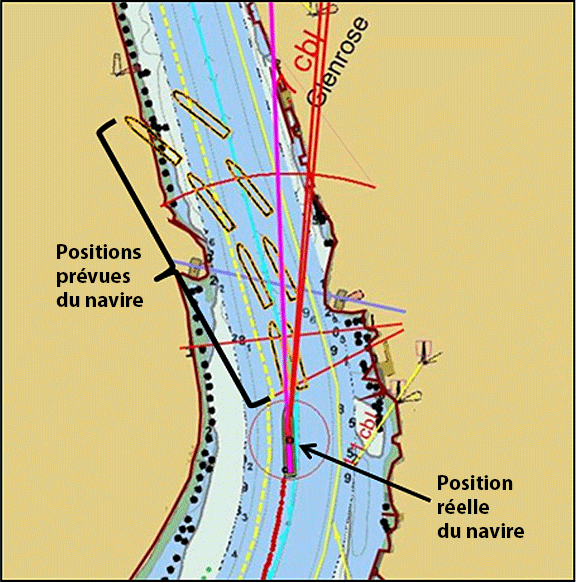 - Le taux de giration du navire a fait dévier ce dernier sur une trajectoire qui l'a mené dans la partie ensablée du bras sud du chenal.