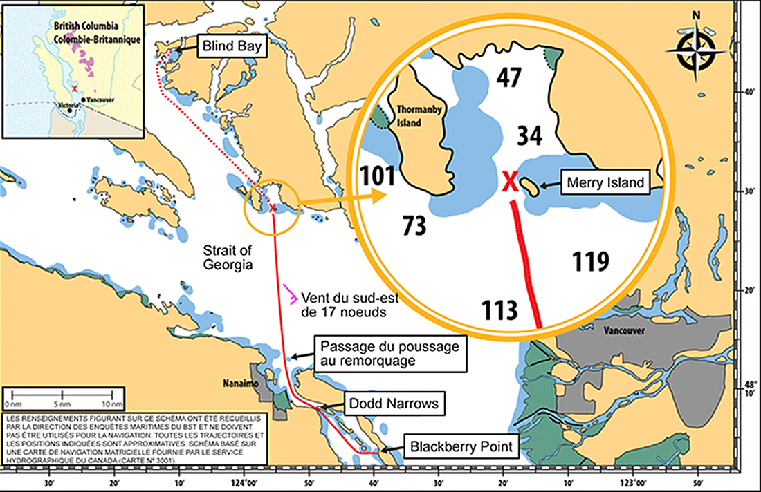 Lorsque le remorqueur et le chaland se sont trouvés à environ 1 mille marin (nm) au sud-ouest de l’île Merry, le capitaine a remarqué que le remorqueur réagissait mollement. À 15 h 22, il a communiqué avec les Services de communication et de trafic maritime, centre de Comox (Colombie-Britannique) à la position d’appel habituelle et a averti qu’il allait ralentir afin de vérifier le câble. Après avoir décéléré, le remorqueur a commencé à couler par la poupe, jusqu’à ce que cette dernière soit submergée par 0,5 m d’eau environ. Le capitaine a immédiatement alerté le matelot de pont et, à environ 15 h 30, ils ont largué le câble et laissé partir le chaland à la dérive.
