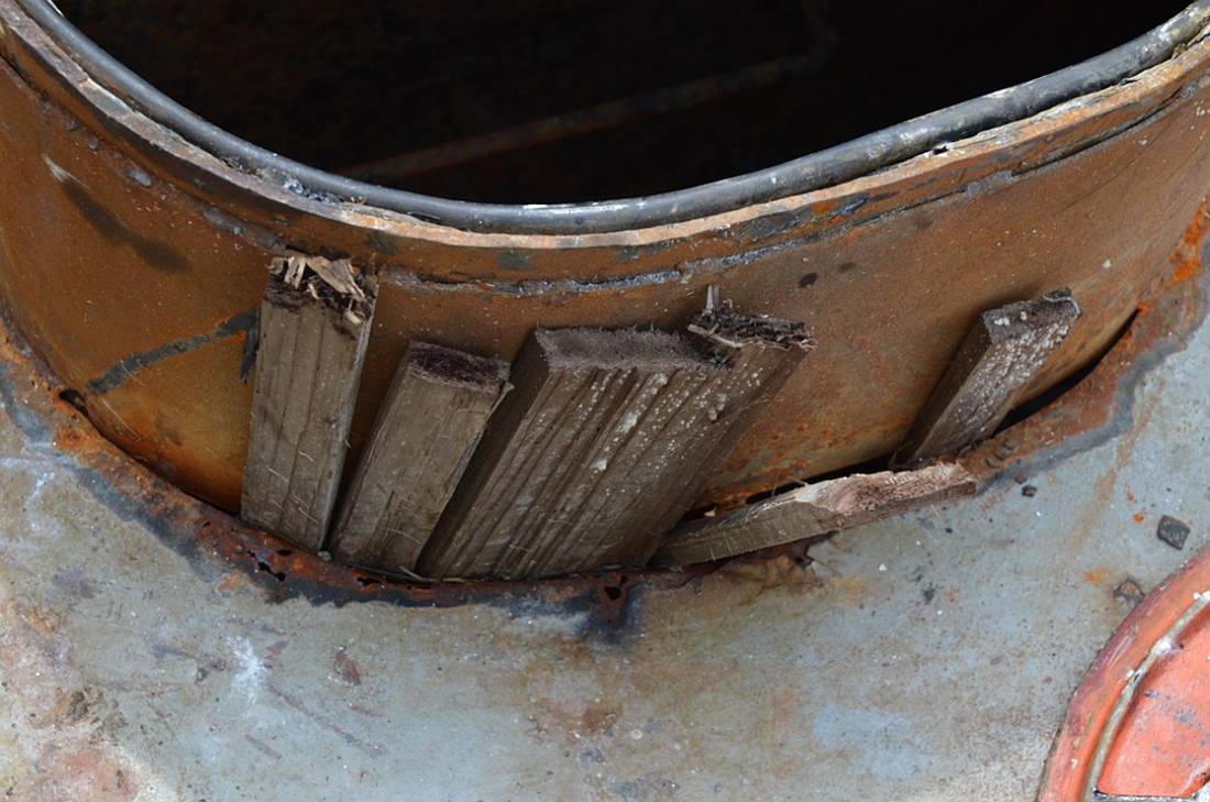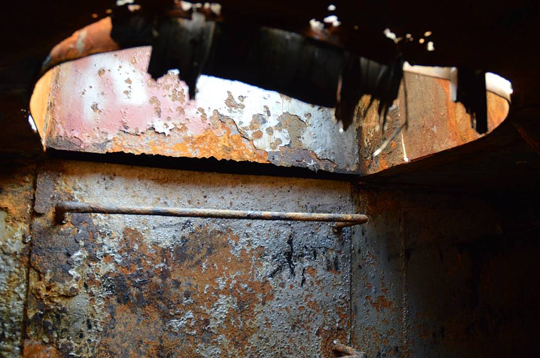 Photo C2. Gros plan sur l'orifice de ventilation tribord vu du dessous de la plateforme de travail