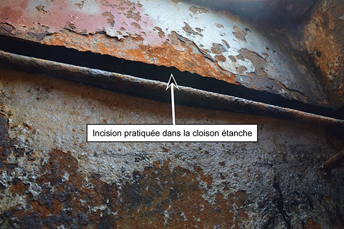 • l’incision pratiquée dans la cloison étanche n’avait été ni réparée ni protégée pour empêcher l’eau de passer d’un compartiment à l’autre de la coque;
