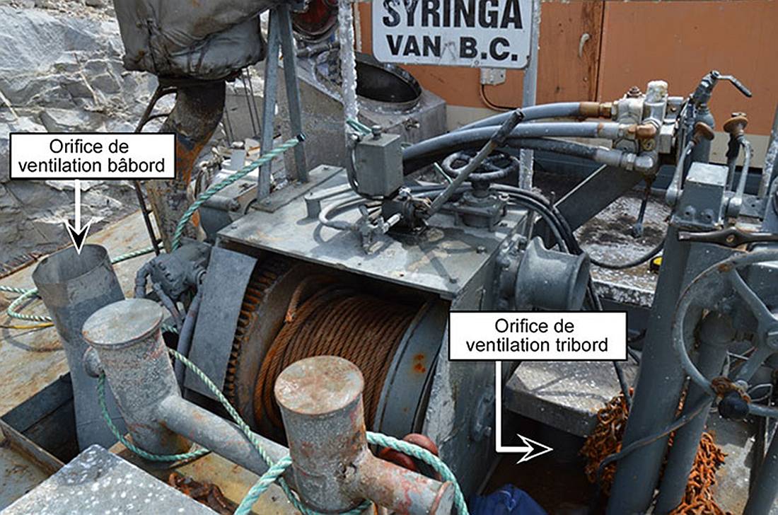 • ni l’orifice de ventilation tronqué côté tribord ni les presse-étoupes présents dans le puits du treuil n’étaient protégés contre les infiltrations d’eau;