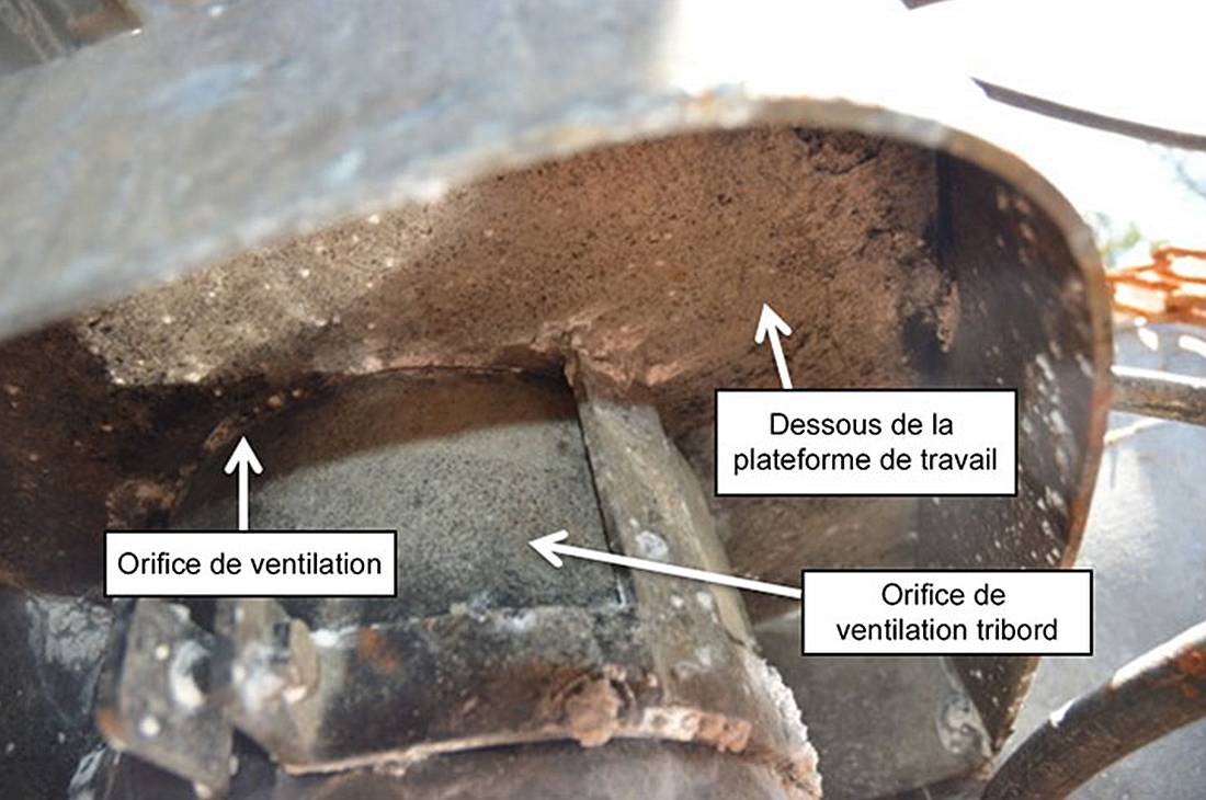 Photo du gros plan sur l'orifice de ventilation tribord vu du dessous de la plateforme de travail