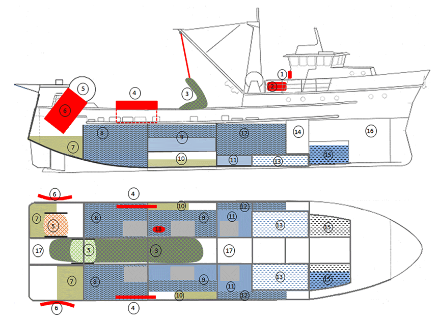 Une rampe était ménagée dans l'axe longitudinal sur toute la longueur du pont de pêche et donnait accès à chacune des 6 cales à poisson conçues pour transporter le poisson dans de l'eau de mer réfrigérée. Il y avait 2 tambours Note de bas de page 5 à la poupe et 2 jeux de panneaux de chalut, ainsi que 2 treuils de chalut montés sur le pont intermédiaire (photo 2).