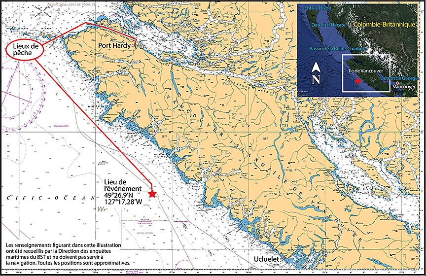 Le 5 septembre 2015, vers 15 h 30, heure avancée du Pacifique, le chalutier Caledonian a chaviré à 20 milles marins à l’ouest du détroit Nootka (Colombie-Britannique), pendant une sortie de pêche au merlu avec 4 membres d’équipage à bord. Après le chavirement, le capitaine et l’officier de pont sont montés sur la coque retournée où ils sont restés plusieurs heures, puis ont abandonné le navire lorsque ce dernier a fini par couler; l’officier de pont a nagé vers le radeau de sauvetage dans lequel il a embarqué. Par la suite, la Garde côtière canadienne a secouru l’officier de pont et récupéré les corps du capitaine et des 2 autres membres de l’équipage.