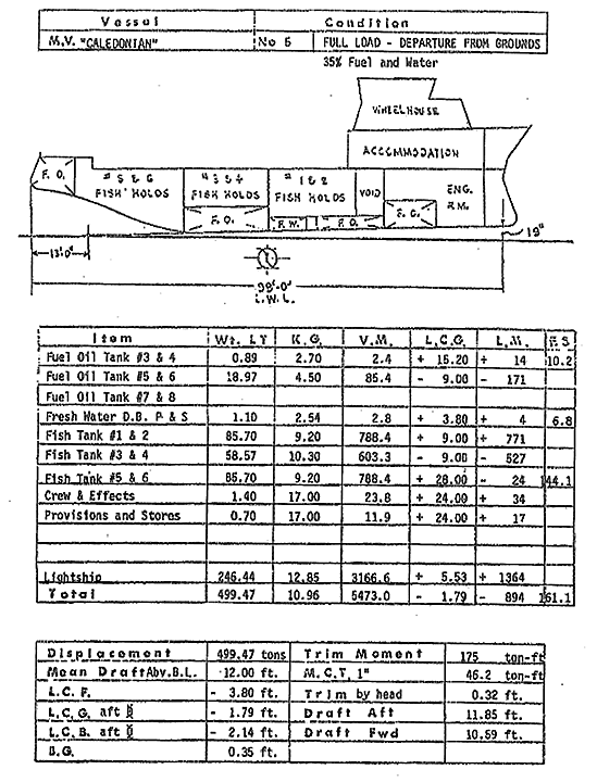Le navire de pêche Caledonian était armé pour le chalutage (photo 1), doté d'une coque en acier soudée et d'un rouf situé en avant du milieu du navire. Le pont principal comprenait la superstructure avant (incluant le rouf) et le pont de pêche. Sous le pont principal se trouvaient la salle des machines (située à l'avant), 6 cales à poisson (3 de chaque côté) et 8 réservoirs de carburant (4 de chaque côté). Il y avait également des citernes d'eau douce sous les cales à poisson situées à l'avant.