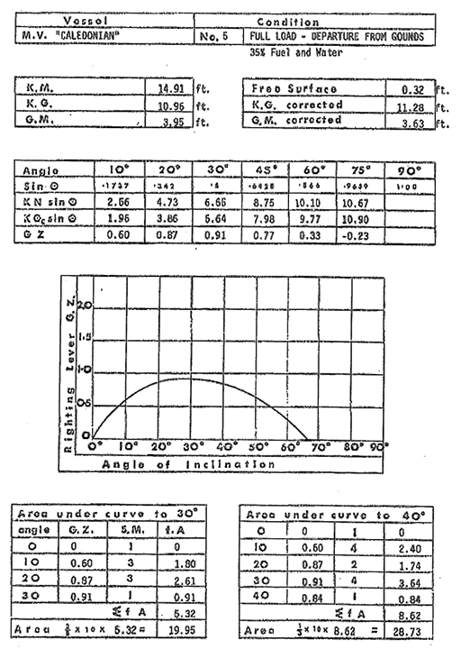 Vers 22 h, le navire a coulé rapidement par la proue. L'officier de pont et le capitaine ont sauté à l'eau. Le capitaine s'est accroché au VFI de l'officier, mais il était impossible de maintenir 2 personnes à flot de cette manière, le capitaine a donc lâché prise. À partir de ce moment, le courant les a éloignés l'un de l'autre et l'officier de pont a perdu le capitaine de vue. L'officier de pont a remarqué un feu à une distance de quelque 20 mètres et s'est mis à nager dans cette direction : c'était le feu du tendelet du radeau de sauvetage du Caledonian .