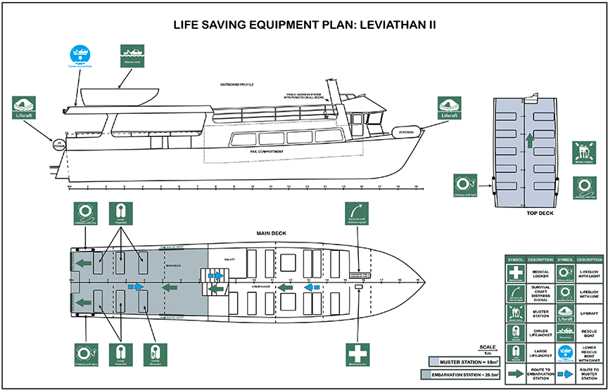 TC exigeait que le Leviathan II transporte de l'équipement de sauvetage pour 50 personnes. Au moment de l'événement à l'étude, le navire transportait tout l'équipement requis, dont :