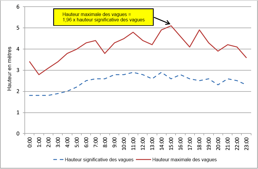 Des données archivées de hauteur significative et maximale des vagues enregistrées à la bouée météorologique du banc La Pérouse sont disponibles auprès de Pêches et Océans Canada Note de bas de page 16 et sont présentées à la figure 2. Les prévisions de la hauteur des vagues d'Environnement Canada Note de bas de page 17 comprenaient l'avertissement suivant :