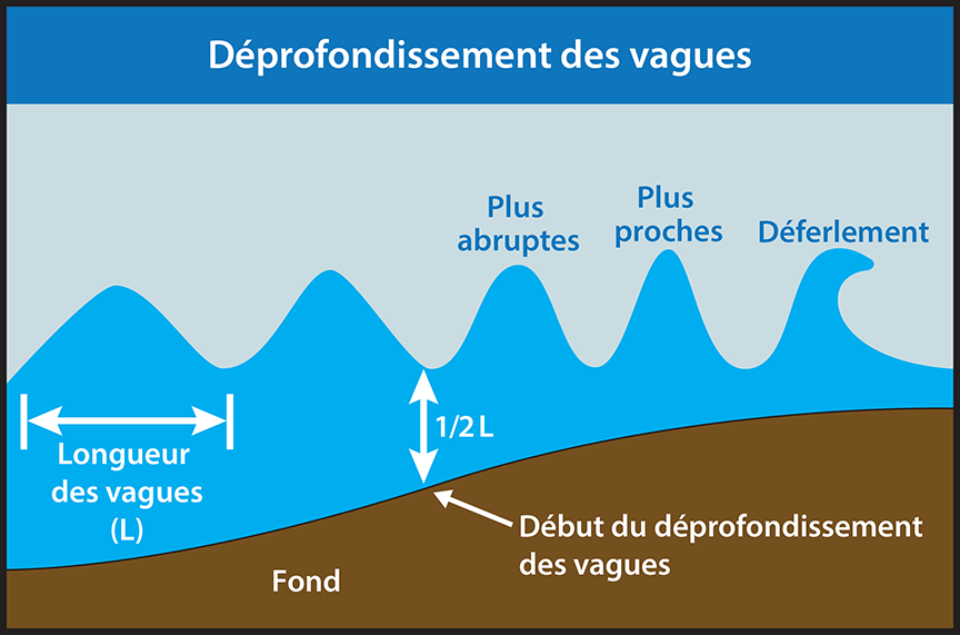 Une vague déferlante est une vague qui s'élève, se recourbe vers l'avant et se brise. Les vagues déferlantes peuvent être causées par un déprofondissement des vagues, phénomène se produisant lorsque des « vagues en eau profonde s'approchent d'une zone peu profonde ou [d'un] "haut-fond" ». Dans une telle situation, les vagues ralentissent lorsqu'elles atteignent des eaux dont la profondeur est inférieure à la moitié de leur longueur d'onde (représentée par la lettre L à la figure 3). Le ralentissement des vagues « entraîne le rapprochement de leurs crêtes et l'augmentation de leur hauteur et de leur inclinaison ». Ensuite, « [l]orsqu'elles atteignent une taille similaire à la profondeur de l'eau, elles se recourbent vers l'avant et [...] déferlent » (figure 3).