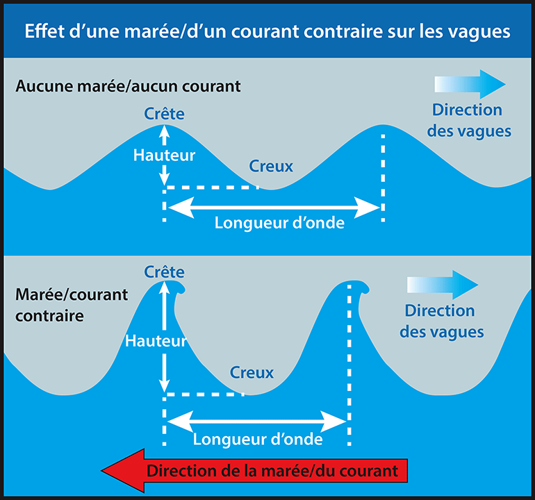 Les marées et les courants contraires aux vagues constituent d'autres facteurs pouvant causer une diminution de la longueur d'onde et une augmentation de la hauteur des vagues (figure 4). Dans de telles conditions, l'escarpement des vagues augmente rapidement, ce qui fait croître la probabilité qu'elles déferlent.