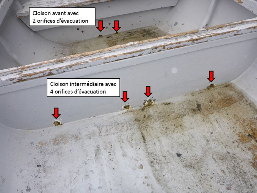 Pour laisser l'eau s'écouler vers le tableau arrière, les cloisons sont percées au niveau du pont, soit de 2 trous en demi-lune (9 cm de diamètre) dans le cas des cloisons avant et arrière, et de 4 trous ronds (5 cm de diamètre) dans le cas des 2 cloisons intermédiaires. Quant au tableau, il est percé de 1 orifice d'évacuation (2,5 cm de diamètre) et muni d'un bouchon amovible (annexe A).