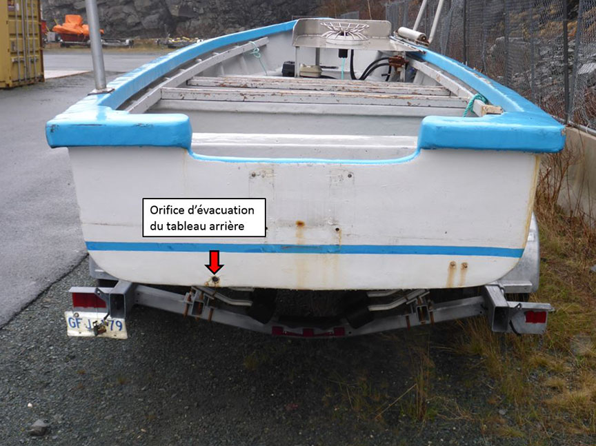 L'inspection du bateau après sa récupération a permis de déterminer que sa coque n'était pas endommagée. Le bouchon était bien enfoncé dans l'orifice d'évacuation du tableau arrière. Le compartiment de rangement avant était dépourvu de contenu et de couvercle. Le réservoir d'essence métallique du moteur qui entraînait le haleur de filets hydraulique était déformé, vraisemblablement par la pression d'eau lorsque le bateau reposait sous 75 m d'eau. Une grande partie de l'éperon du moteur hors-bord manquait par suite d'un accident antérieur sans rapport avec l'événement à l'étude. Le dessus du capot moteur était fracturé; toutefois, on n'a pu déterminer si ce dommage était antérieur à l'événement ou s'il a été causé par le choc du bateau avec le fond marin lorsqu'elle a coulé. Le moteur se trouvait en position relevée de rangement, et la batterie de 12 volts n'était reliée que par 1 fil.