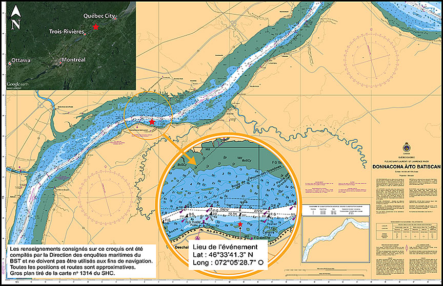 Le 22 janvier 2016, le MSC Monica a quitté Montréal (Québec), descendant le fleuve Saint-Laurent en route vers Saint-John (Nouveau-Brunswick). Le changement de pilotes normal à Trois-Rivières (Québec) a eu lieu vers 6 h 15Note de bas de page 6, et 2 pilotes de la Corporation des pilotes du Saint-Laurent central (CPSLC)Note de bas de page 7, soit le pilote 1Note de bas de page 8 et le pilote 2, sont montés à bord. Les pilotes et le capitaine ont procédé à un échange d'information en bonne et due forme. Pendant l'échange, les 2 pilotes ont confirmé le contenu de la fiche de pilotage, et le capitaine les a renseignés sur les caractéristiques techniques et de manœuvre du navire. Au cours de l'échange, les pilotes et le capitaine ont aussi discuté du plan de voyage sur le fleuve jusqu'au prochain point de changement de pilotes à Québec (Québec).