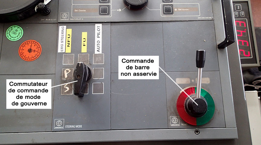 Avant le départ de Québec, l'équipage a modifié la présentation de la commande de barre non asservie : on a enlevé le disque de plastique translucide fixé à sa base et apposé de chaque côté de la commande deux étiquettes de couleur : une rouge avec le mot PORT (bâbord) et une verte avec l'abréviation STBD (starboard [tribord]) (figure 9).