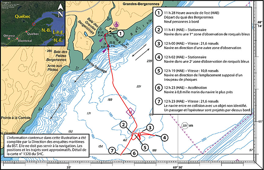 - Lorsque le navire s'est trouvé à 0,8 mille marin du navire le plus près, l'opérateur a commencé à accélérer pour atteindre 25 nœuds, croyant qu'il respectait l'exigence réglementaire du parc marin du Saguenay–Saint-Laurent de se trouver à 1 mille marin du navire le plus près en zone d'observation.