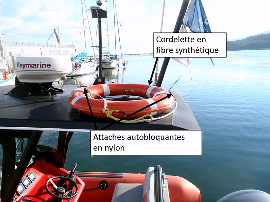 Par le passé, l'Aventure 6 et ses navires jumeaux avaient quelquefois perdu des bouées de sauvetage en mer; les sangles de type bateau de plaisance utilisées pour arrimer la bouée au navire n'étaient pas conçues pour supporter le vent, les vibrations et les mouvements brusques rencontrés lors des excursions en mer. Pour prévenir la perte d'autres bouées, le dispositif d'arrimage a été modifié sur toute la flotte par l'ajout de cordelettes en fibre synthétique et d'attaches autobloquantes en nylon (figure 3).