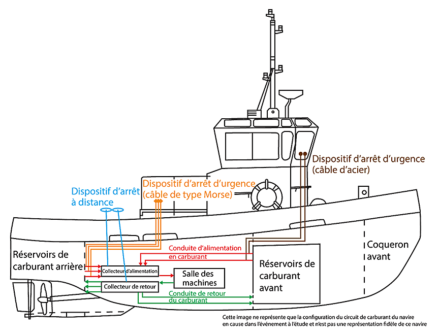 Le navire est doté de 5 réservoirs de carburant diesel pour alimenter les moteurs principaux et la génératrice. Il y a 2 réservoirs à l'avant et 2 réservoirs à l'arrière, de chaque côté du navire. On retrouve aussi un réservoir de talon de quilleNote de bas de page 3 central situé entre les 2 réservoirs arrière. Les réservoirs sont reliés à un collecteur commun d'alimentation et de retour par de la tuyauterie en acier (annexe A). Chaque réservoir est doté d'un robinet indépendant d'alimentation et de retour situé dans la salle des machines. Des tiges allongées permettent la manœuvre de ces robinets depuis le pont principal. Chaque réservoir de carburant est en outre doté d'un robinet d'arrêt d'urgence. Les robinets d'arrêt d'urgence des réservoirs avant sont reliés par des câbles d'acier à des leviers de commande situés dans la timonerie qui permettent la manœuvre à distance des robinets. Les robinets d'arrêt d'urgence des réservoirs arrière peuvent être actionnés à l'aide de leviers de commande situés à bâbord sur le pont principal qui sont reliés aux robinets par des câbles de commande recouverts d'une gaine de plastique.