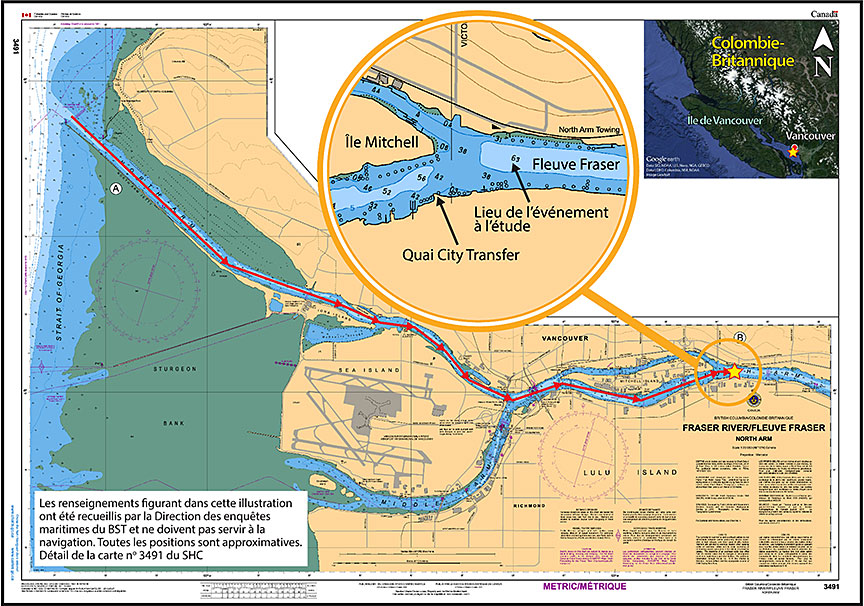 Le 11 juillet 2016, le Ken Mackenzie remorquait environ 30 sections de billesNote de bas de page 4 à environ 2,5 nœuds sur le fleuve Fraser (Colombie-Britannique) avec 2 personnes à son bordNote de bas de page 5. Le remorqueur Harken No. 5 assistait le Ken Mackenzie avec 2 personnes à son bord; le remorqueur déposait des sections remorquées (coupes) à des endroits préalablement définis le long du fleuve.