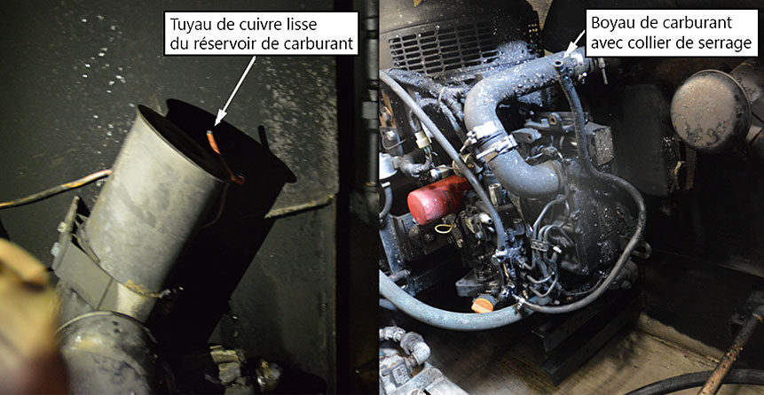 La conduite de retour de carburant diesel reliant la pompe à carburant de la génératrice au réservoir de carburant se composait d'un boyau à carburant de 6 mm et d'un tuyau de cuivre de 8 mm. Le tuyau de cuivre installé en 2009 était lisse, et son extrémité ne comportait pas de cannelures ni de bourrelet. Un seul collier de serrage maintenait le tuyau de cuivre et le boyau de carburant flexible l'un à l'autre. Le boyau de carburant flexible et le tuyau de cuivre se sont séparés, ce qui a entraîné la pulvérisation de carburant diesel sur les composants de la génératrice. Ce carburant s'est enflammé, ce qui a déclenché l'incendie.