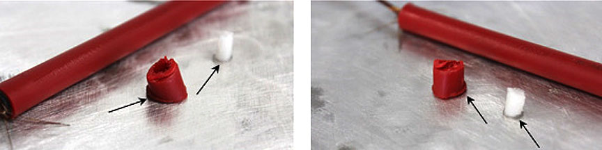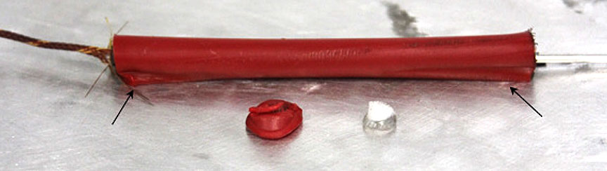 - Des essais de chauffage en laboratoire (figures 4 et 5) ont permis de constater que les matériaux à base de polyéthylène de la gaine et du manchon des câbles de commande commencent à fondre lorsque la température dépasse 110 °C. La chaleur a détruit la gaine et le manchon à des températures d'environ 130 °C et d'environ 135 °C, respectivement.
