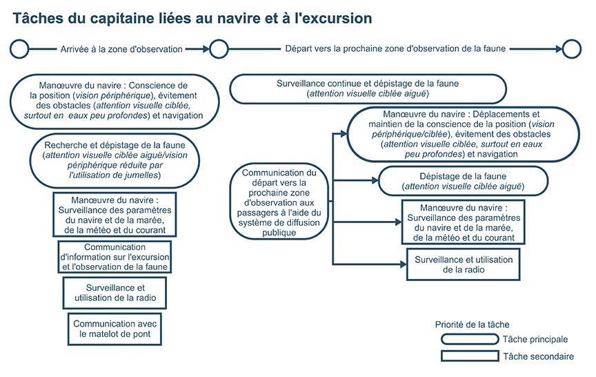 La navigation et la manœuvre d'un navire nécessitent aussi l'exécution d'un certain nombre de tâches visuelles, dont la vérification de la position au moyen d'aides à la navigation, la consultation des instruments pour surveiller la vitesse et le cap ainsi que la surveillance de la surface de l'eau pour y déceler les dangers. Pour accomplir ces tâches visuelles, une personne doit porter une attention rapide et ciblée continue ou séquentielle à des images proches et éloignées. En plus de naviguer et de manœuvrer le navire, le capitaine s'employait à chercher des animaux et à les suivre du regard.