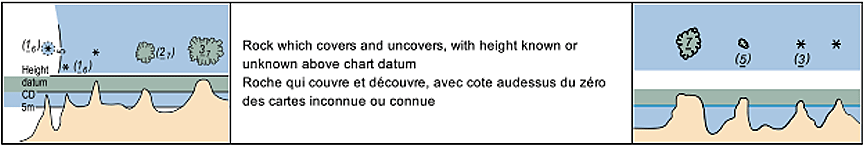 Les récifs et les rochers découvrants sont les dangers les plus communs dans les eaux peu profondes du canal Fortune et de la baie Warn. De loin, ces formations peuvent avoir l'air de masses sombres dans certaines conditions d'éclairage. Il peut être difficile de repérer visuellement ces dangers s'il y a peu de contraste entre la surface de ceux-ci et les eaux sombres, surtout s'ils sont à fleur d'eau. Plus précisément, ces dangers peuvent être moins nets dans le champ de vision périphérique, et un capitaine ou une vigie peuvent devoir poser le regard directement sur ces dangers ou sur des repères géographiques avoisinants pour établir leur position dans l'eau.