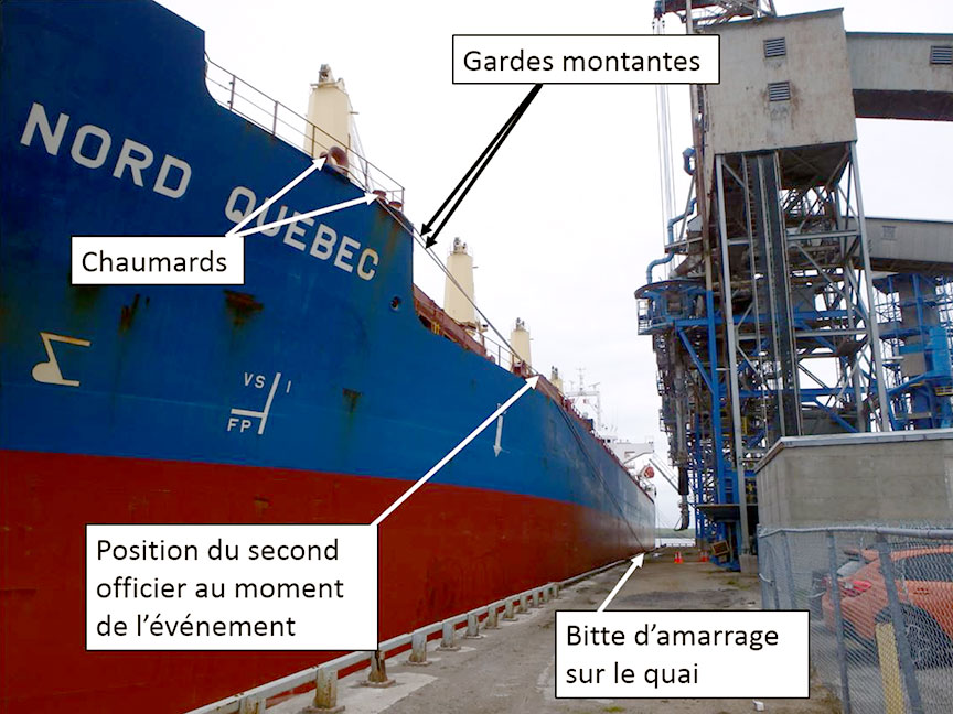 Nord Quebec le long du quai16 au port de Trois-Rivières (Québec) montrant la configuration d'amarrage sur le pont de gaillard d'avant et l'emplacement des chaumards et des gardes montantes de l'avant à la suite de l'événement à l'étude