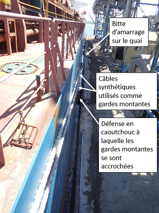 Le plan d'amarrage du navire n'était pas inhabituel; il suivait les pratiques maritimes standards : les 2 gardes montantes ont été les premières envoyées à terre. Toutefois, elles n'ont pas été tendues immédiatement, car le navire se dirigeait à basse vitesse vers la position requise par rapport à l'équipement de chargement des marchandises du quai. Lorsque le pilote a déterminé que le navire était en position, il fallait freiner son mouvement résiduel vers l'avant. Alors que les 2 remorqueurs maintenaient le navire contre le quai, on a tendu les gardes montantes pour immobiliser le navire. Il n'y avait pas d'espace entre la coque du navire et les défenses du quai pour que les gardes montantes puissent se tendre directement des chaumards du navire à la bitte d'amarrage sur le quai. C'est pourquoi les 2 gardes montantes se sont coincées sous les défenses en caoutchouc du quai.