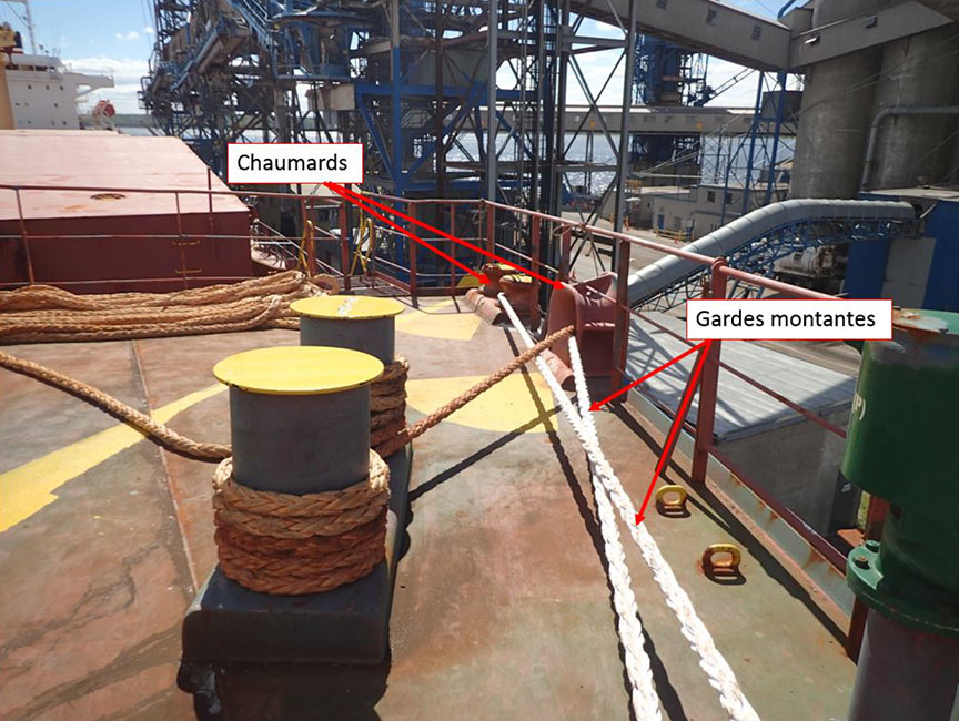 Figure 2. Photo du Nord Quebec le long du quai 16 au port de Trois-Rivières (Québec) montrant la configuration d'amarrage et l'emplacement de la bitte d'amarrage, des chaumards et des gardes montantes de l'avant à la suite de l'événement à l'étude