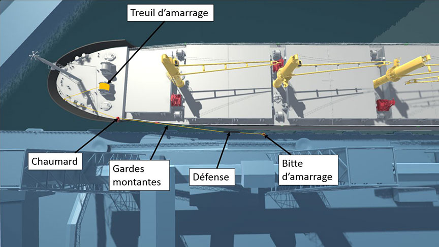 Nord Quebec le long du quai16 au port de Trois-Rivières (Québec) montrant la configuration d'amarrage et l'emplacement de la bitte d'amarrage, des chaumards et des gardes montantes de l'avant à la suite de l'événement à l'étude