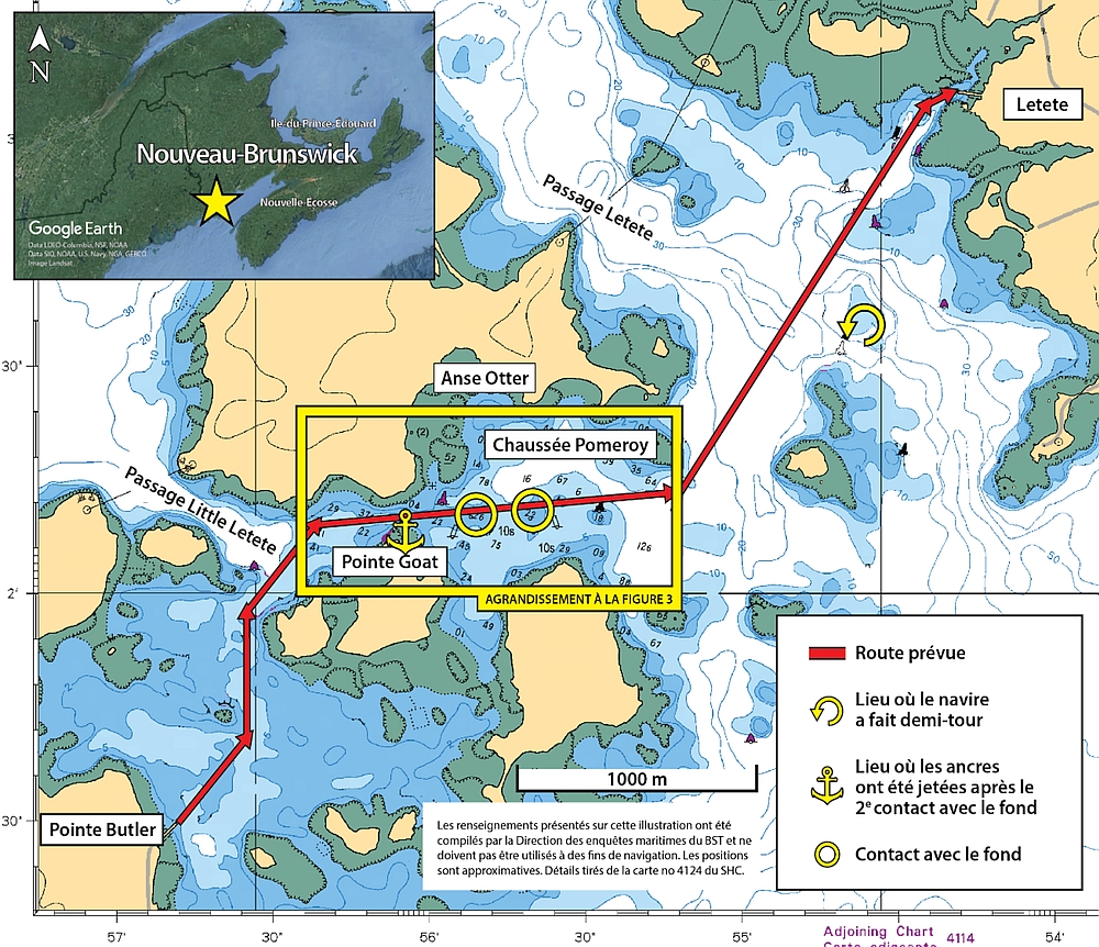 À 19 h 07, le navire a franchi la tour de phare qui marque le point le plus au nord de l’île Jameson, connu sous le nom de pointe Goat, à environ 10 nœuds. Le navire a poursuivi sa route vers l’est et est passé au sud de la bouée SJ2 (figure 3). À 19 h 08, le navire est passé au nord d’un haut-fond d’une profondeur de 2,6 m sur la carte.