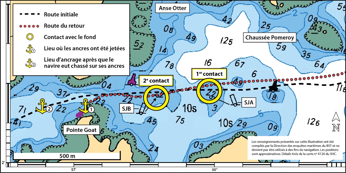 - Étant donné qu’un seul propulseur à entraînement en Z était fonctionnel, la réponse du navire aux corrections de barre visant à contrer les effets des vents forts du nord-ouest et du courant de marée montante à la sortie de l’anse Otter a probablement été retardée et moins efficace qu’avec 2 propulseurs. Par conséquent, après avoir franchi la bouée d’obstacle isolée SJA, le navire a commencé à se diriger vers le sud en direction du haut-fond.
