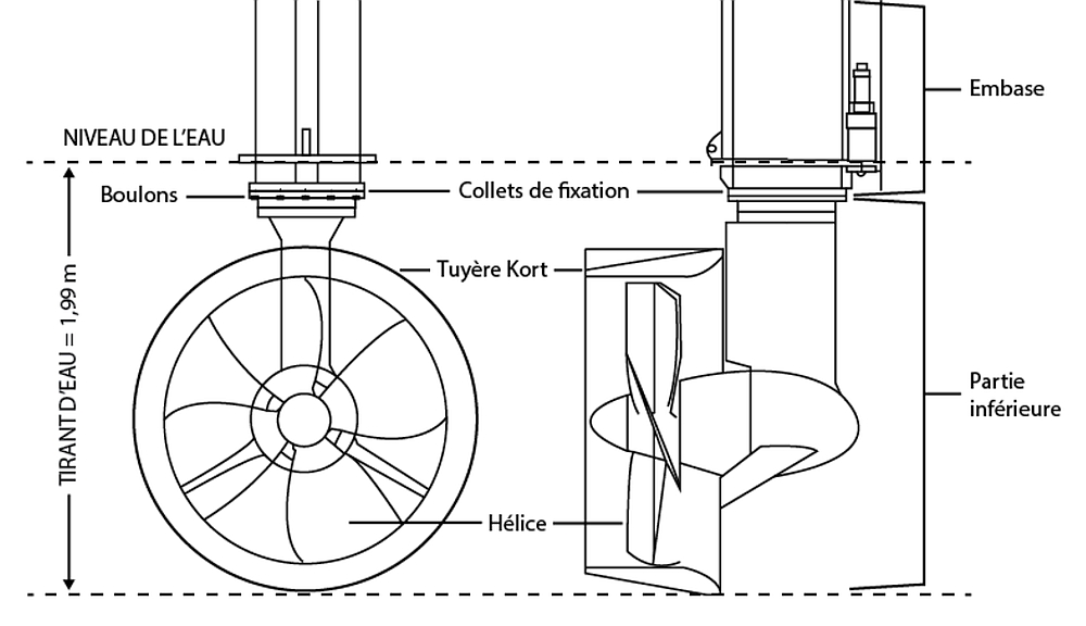 Chaque propulseur est composé d’un arbre d’entraînement horizontal, d’une embase verticale et d’une partie inférieure. La partie inférieure du propulseur à entraînement en Z du navire comprend l’hélice, une tuyère Kort et un collet de fixation. Elle est retenue au collet de fixation de l’embase à l’aide de 14 boulons (figure 4). Lorsque le propulseur à entraînement en Z de l’extrémité Deer Island du navire a heurté le fond, les boulons de fixation ont été arrachés au moment où la partie inférieure s’est détachée de l’embase. Le collet de fixation sur l’embase a également été poussé vers le haut et déformé. Lorsque le propulseur à entraînement en Z de l’extrémité Letete du navire a heurté le fond, les boulons de fixation ont également été arrachés quand la partie inférieure s’est détachée de l’embase. Des plongeurs ont récupéré les parties inférieures des 2 propulseurs à entraînement en Z plus tard. Les parties inférieures ont subi des dommages superficiels à la couche de peinture, tandis que la coque du navire n’a subi aucun dommage.