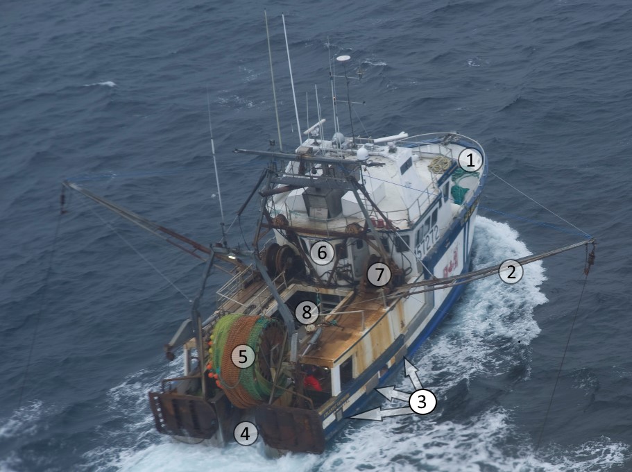 À l’avant de la passerelle se trouvait le pont-abri, qui était muni de 2 treuils de chalut et d’un tambour. Des paravanes d’amortissement du roulis étaient installés de chaque côté du pont.