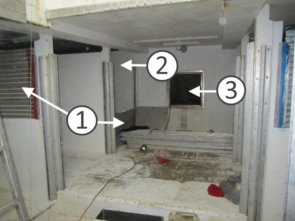 La cale à poisson était constituée de cloisons fixes et de panneaux d’aluminium portatifs, ou planches de séparation. Ces planches pouvaient glisser dans des rails fixés aux cloisons afin de diviser la cale à poisson en compartiments (figure 3). La cale à poisson pouvait être divisée en un maximum de 15 compartiments, soit 5 à bâbord, 5 à tribord et 5 sur l’axe longitudinal du navire. Les planches créaient une séparation entre la prise et la glace, mais elles n’étaient pas étanches.