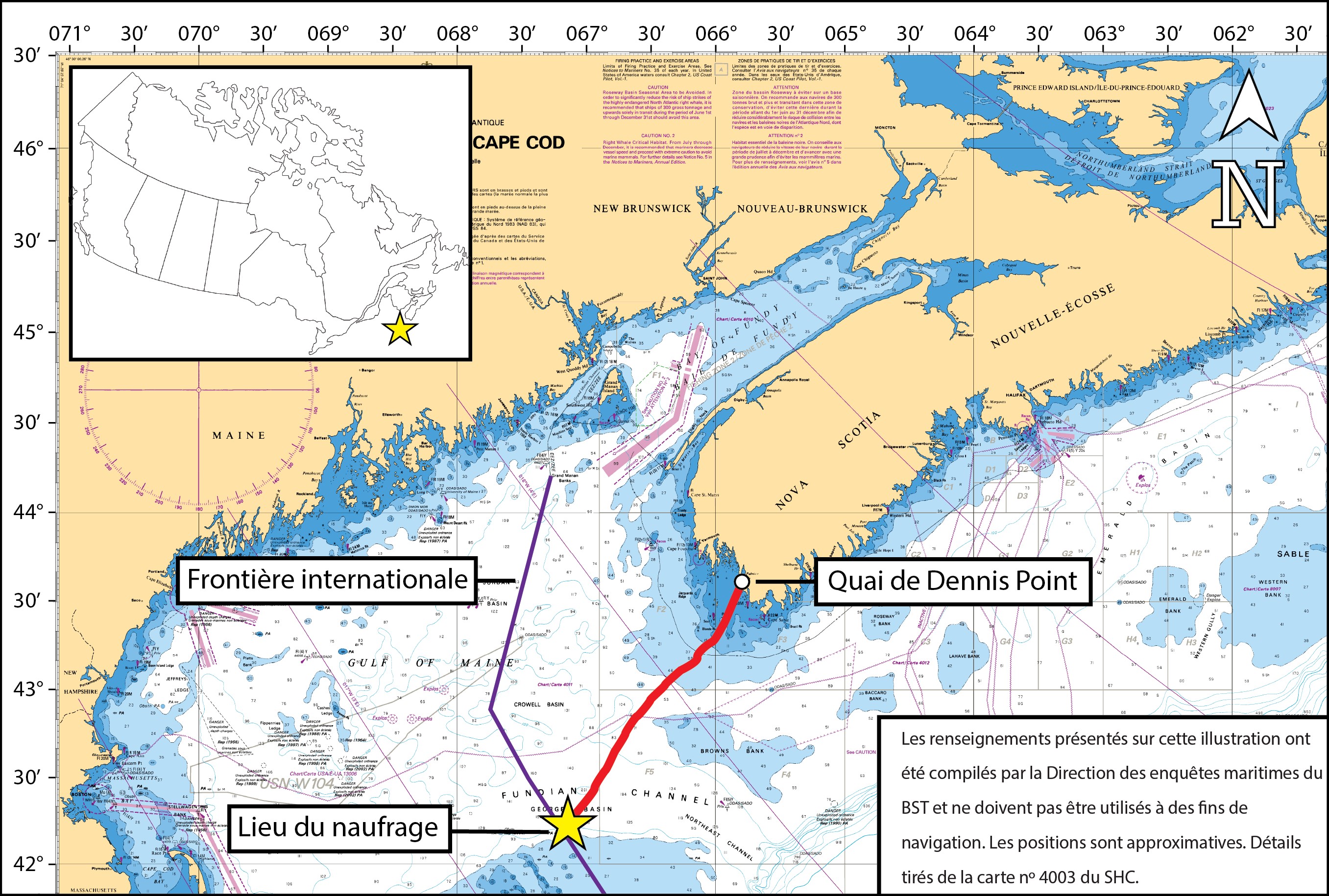 Le 12 décembre 2018, vers 18 hNote de bas de page 2, l’Atlantic Sapphire a quitté le quai de Dennis Point, à Pubnico-Ouest-le-bas (Nouvelle-Écosse). Le navire se dirigeait vers le banc de Georges, qui était à une distance de 105 milles marins (NM), pour pêcher l’aiglefin au chalut (figure 5). L’équipage était composé du capitaine, d’un officier de pont et d’un matelot de pont. Le navire, chargé de 12 longues tonnes de glace, est arrivé au banc à 7 h le 13 décembre et a commencé à chaluter.