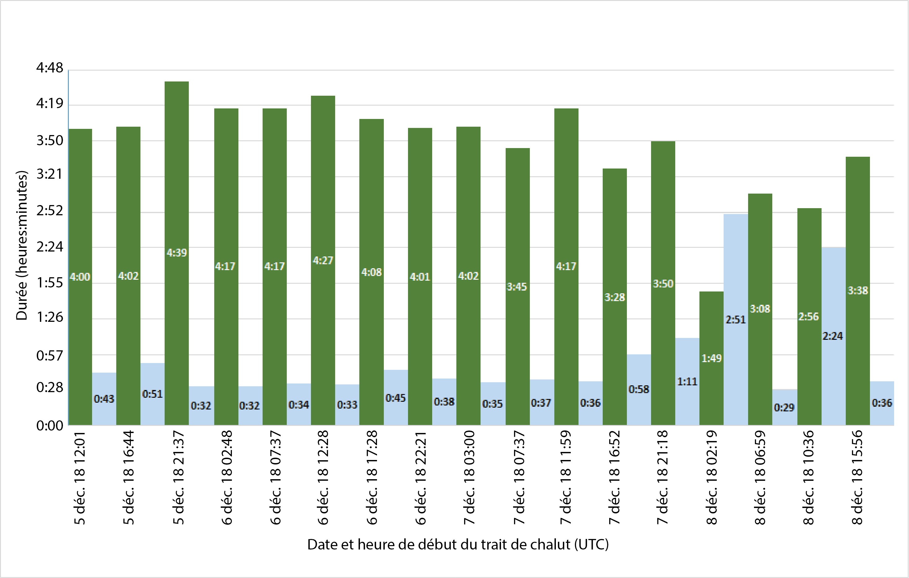 Pour la sortie de pêche du 5 au 9 décembre 2018, l’équipage du navire a pêché durant 3 jours consécutifs. Au cours de ces 3 jours, la plus longue période de repos possible a été de 4 heures 39 minutes, avec un délai moyen de 3 heures 49 minutes (figure A1) entre chaque trait de chalut. Ces durées ne tiennent pas compte du temps nécessaire pour s’acquitter des fonctions de pont, nettoyer, manger et se changer avant de se reposer.