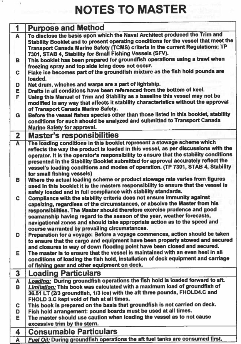 L’équipage a respecté certaines directives indiquées dans le livret de stabilité, comme consommer d’abord le carburant entreposé dans les réservoirs arrière, maintenir une assiette nulle au moment du chargement de la cale à poisson, utiliser les planches de séparation et charger les compartiments avant en premier. D’autres directives n’ont pas été respectées systématiquement; par exemple, le poids combiné des poissons et de la glace dans la cale à poisson dépassait souvent les 36,51 longues tonnes, et la cale à poisson ne portait pas de marque permanente pour indiquer le niveau représentant 90 % de sa capacité.
