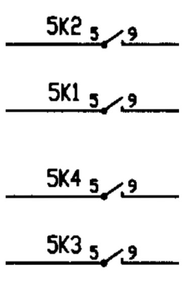 Les relais 5K1, 5K2, 5K3 et 5K4 sont théoriquement compatibles avec les solénoïdes de 24 V c.c./30 watts qu'ils commandaient. Par contre, ce modèle particulier de relais était conçu comme un contact de relais de transfert (type C) à usage général. Ce type de relais ne convient pas aux tensions supérieures à la tension nominale de 28 V c.c. qui sont générées lorsque le contact est rompu par la force contre-électromotrice inhérente à la charge inductive produite par le solénoïde. D'autres types de relais sont conçus spécifiquement pour composer avec les conditions difficiles créées par ces charges inductives.