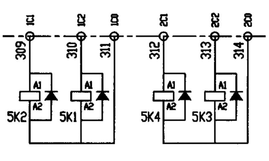 Les contacts des relais peuvent subir des surtensions et des surintensités pendant la commutation de charges inductives, comme à des solénoïdes à courant continu. Pour protéger un contact au moment de son ouverture, il est important que ces surtensions ou surintensités soient absorbées (p. ex., par une diode). Le système de commande électrique de l'appareil à gouverner du Chem Norma n'avait aucun mécanisme de protection des relais de commande contre les surtensions et les surintensités (figure 2); les bobines des relais de commande étaient toutefois protégées par une diode qui leur était connectée en parallèle (figure 3).