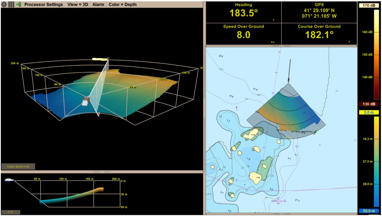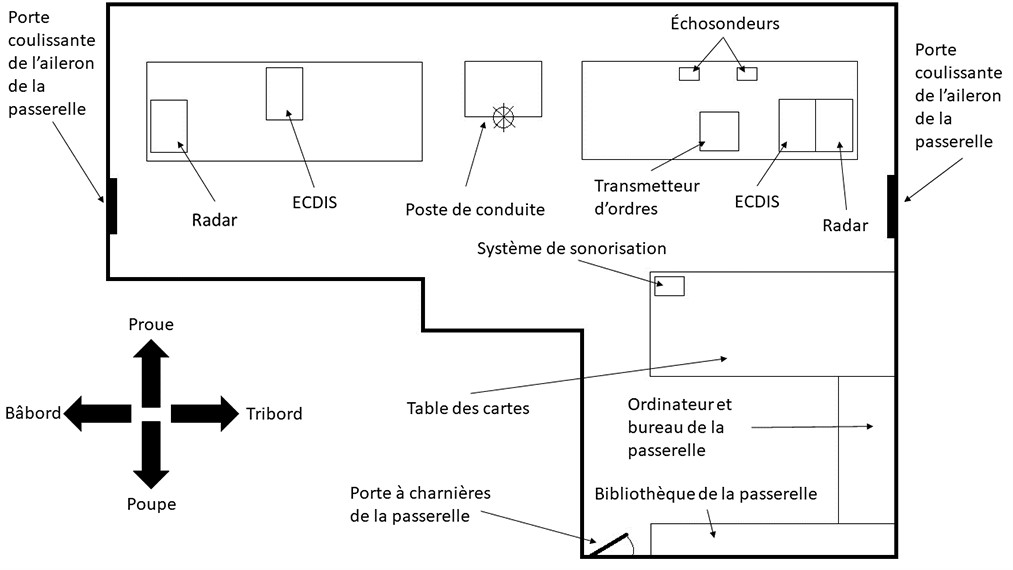 La passerelle de navigation du navire compte 2 échosondeurs de navigationNote de bas de page 4 homologués par la classe, avec des alarmes sonores et visuelles d’eaux peu profondes, de perte de détection du fond marin et de panne d’alimentation. Les alarmes des échosondeurs peuvent être désactivées manuellement par l’utilisateur. Deux systèmes électroniques de visualisation de cartes marines (ECDIS) sont installés respectivement sur les consoles bâbord et tribord de la passerelle. Un système de sonorisation est installé à bord et son panneau de commande est situé dans la partie la plus à l’avant de la passerelle, sur une console devant la table des cartes (figure 2).