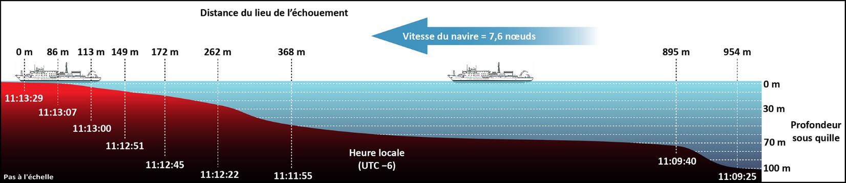 Le 24 août 2018, le navire à passagers Akademik Ioffe s’est échoué à environ 78 milles marins au nord-nord-ouest de Kugaaruk (Nunavut). L’Akademik Ioffe traversait un passage dans une région éloignée de l’Arctique canadien qui n’avait pas été sondée en employant des normes hydrographiques modernes ou adéquates. De plus, aucun des membres de l’équipage ne s’était rendu dans cette région auparavant. Le navire s’est échoué à une vitesse de 7,6 nœuds avant que l’équipe à la passerelle ne puisse prendre des mesures d’évitement; les membres de l’équipe ne surveillaient pas de près les échosondeurs, et la diminution constante de la profondeur de l’eau sous quille est passée inaperçue pendant plus de 4 minutes, car les alarmes de faible profondeur des échosondeurs avaient été inactivées.