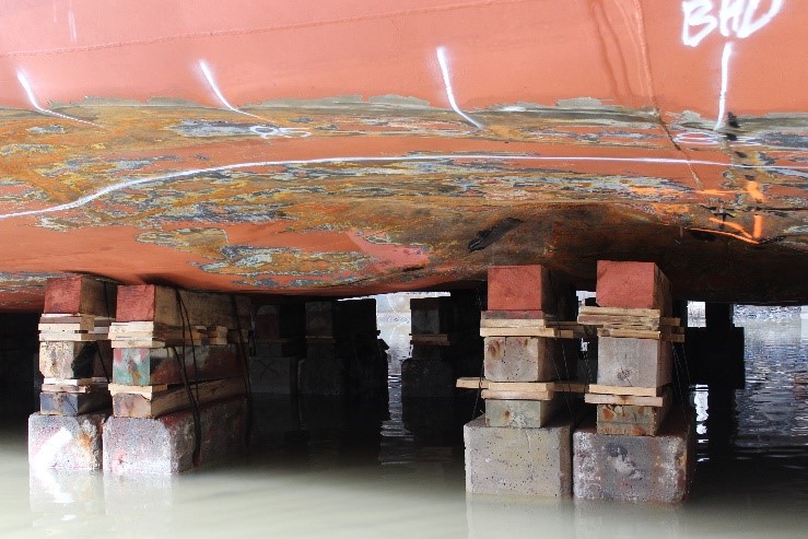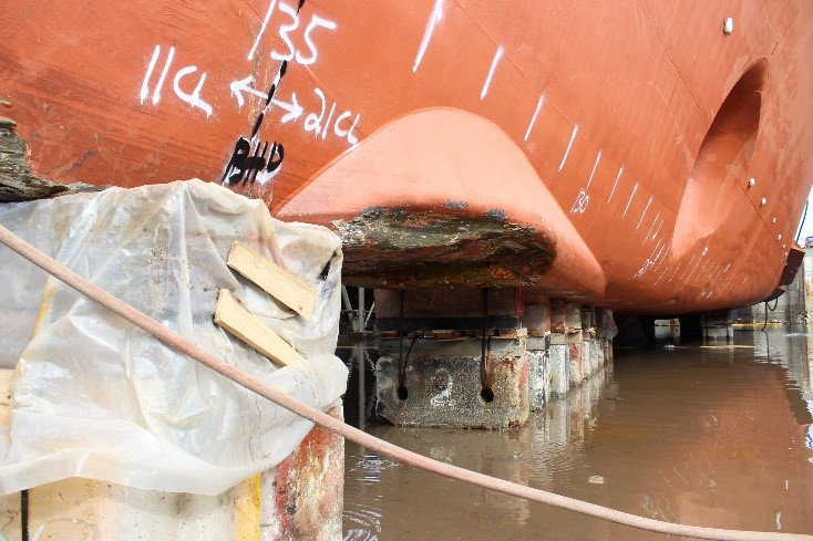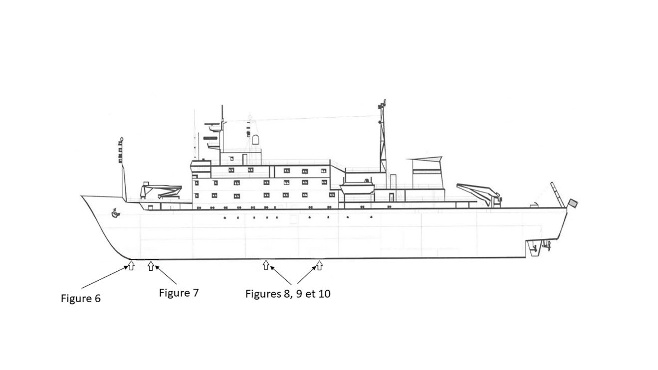 Le 28 septembre et le 3 octobre 2018, le BST s’est rendu au chantier naval des Méchins pour prendre note des dommages subis par la coque par l’Akademik Ioffe (figures 6, 7, 8, 9 et 10).
