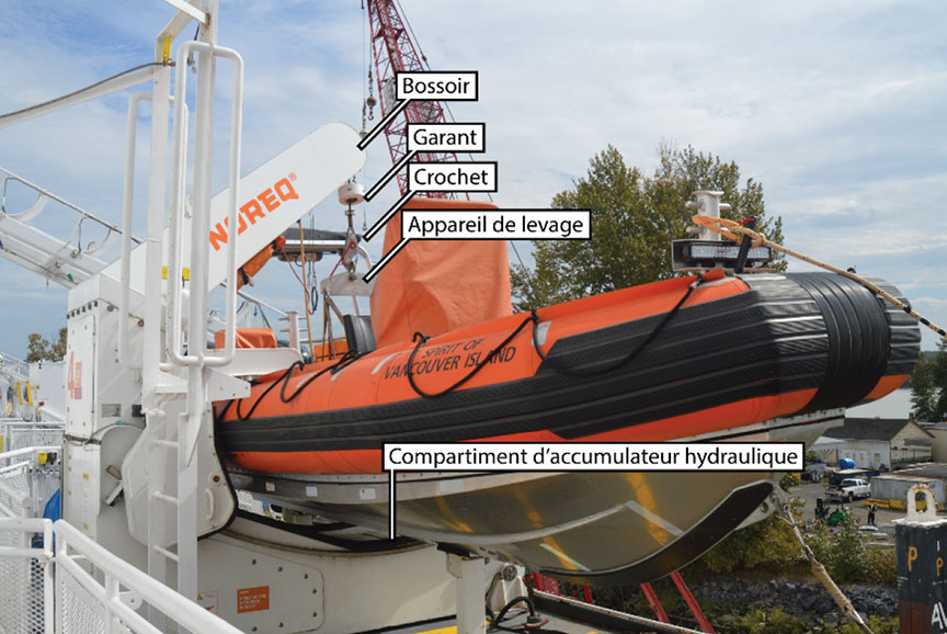Durant les travaux de diagnostic, le technicien a informé le matelot de pont qu’il allait charger d’azote l’accumulateur hydraulique. Afin de permettre au technicien d’accéder au compartiment d’accumulateur, le matelot de pont a abaissé le canot de secours jusqu’à la surface de l’eau et a relâché le garant de quelque 75 cm à 100 cm avant de relever le bossoir à sa hauteur maximale. Pendant que le technicien chargeait d’azote l’accumulateur hydraulique, le canot de secours inoccupé flottait sur l’eau, le garant relâché; la manille de levage et le crochet reposaient sur le dessus du réservoir de carburant. Le processus a duré environ 20 minutes.