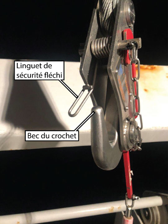 Après l’événement, le premier mécanicien, le matelot de pont et le technicien ont inspecté le crochet. Ils ont constaté que son linguet de sécurité à ressort était fléchi de côté, ce qui laissait un jeu entre le linguet et le bec du crochet (figure 3). On n’a pas pu déterminer quand ni comment cette déformation s’est produite.