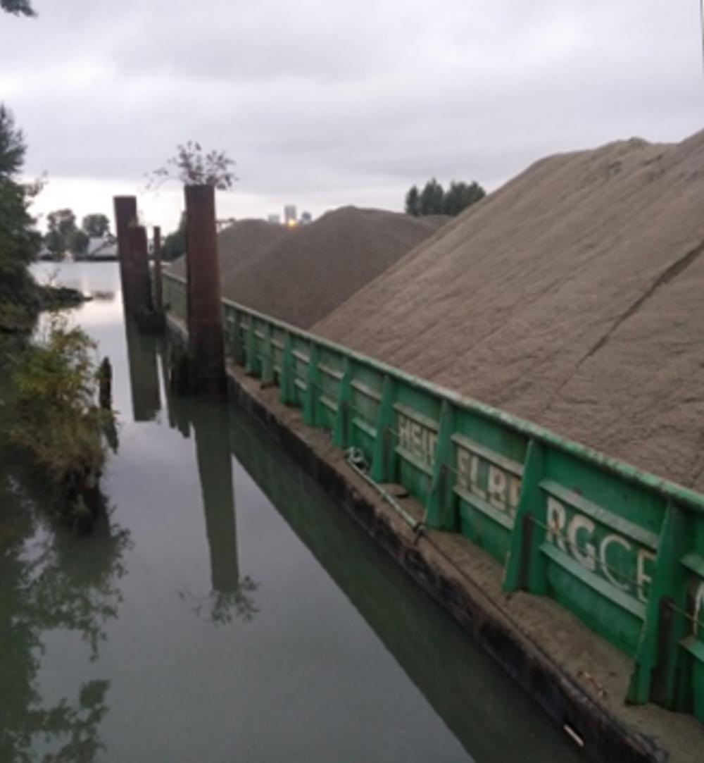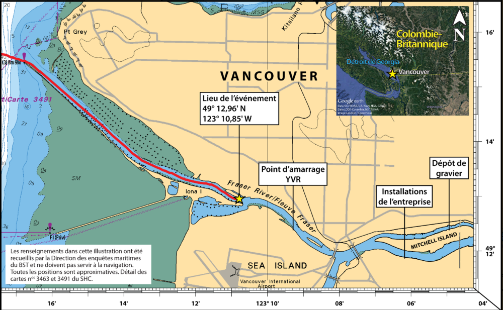 Juste avant d'entrer dans le bras nord du fleuve Fraser (figure 4) vers 21 h, le Westview Chinook a arrêté de pousser pour permettre à l'équipage du George H Ledcor de raccourcir le câble de remorque de manière à ce que la distance entre le remorqueur et le chaland soit d'environ 15 m. Une fois le câble de remorque raccourci, le remorqueur et le chaland sont entrés dans le fleuve, et le Westview Chinook a recommencé à pousser. À un certain moment avant de s'engager dans le fleuve, l'équipage avait fermé les portes et les écoutilles étanches du George H Ledcor, conformément aux pratiques de travail sécuritaires de Ledcor.