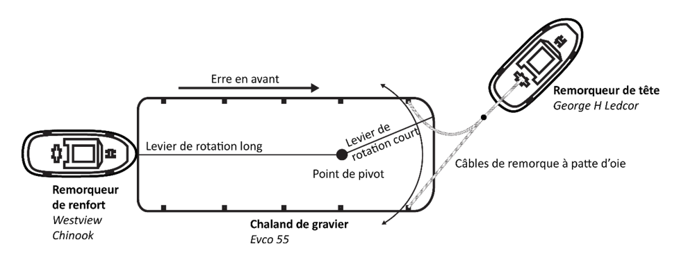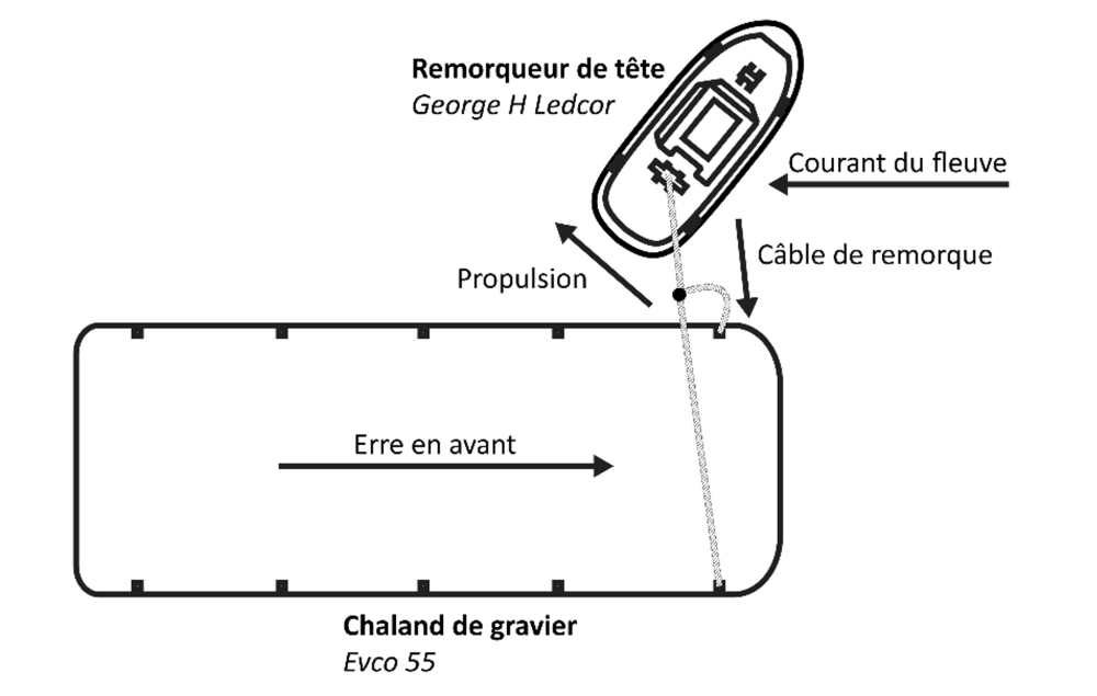 L'Evco 55 a commencé à rattraper le George H Ledcor, tirant le câble de remorque qui reliait les deux navires sur le côté tribord du remorqueur. Le remorqueur a alors commencé à gîter à tribord et s'est trouvé engagéNote de bas de page 5. Le capitaine a tenté de ramener le remorqueur devant le chaland en mettant plein gaz et en poussant la barre complètement à tribord. Cela l'a fait gîter encore plus à tribord.