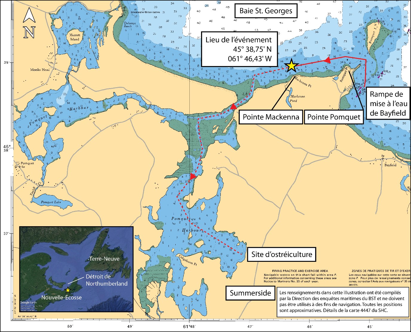Puisqu’il ne restait pas beaucoup de chemin à faire avant d’atteindre l’entrée du havre de Pomquet et que le bateau risquait de chavirer si l’on faisait demi-tour, on a poursuivi le voyage. Le navire a chaviré vers 14 h 25, à environ 50 m du rivage, près de la pointe Mackenna, à 45° 38,75′ N, 061° 46,43′ W. Aucun appel de détresse n’a été effectué.
