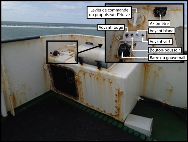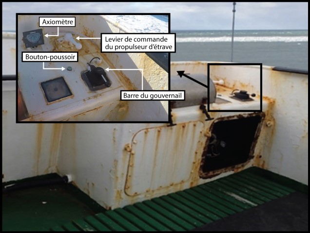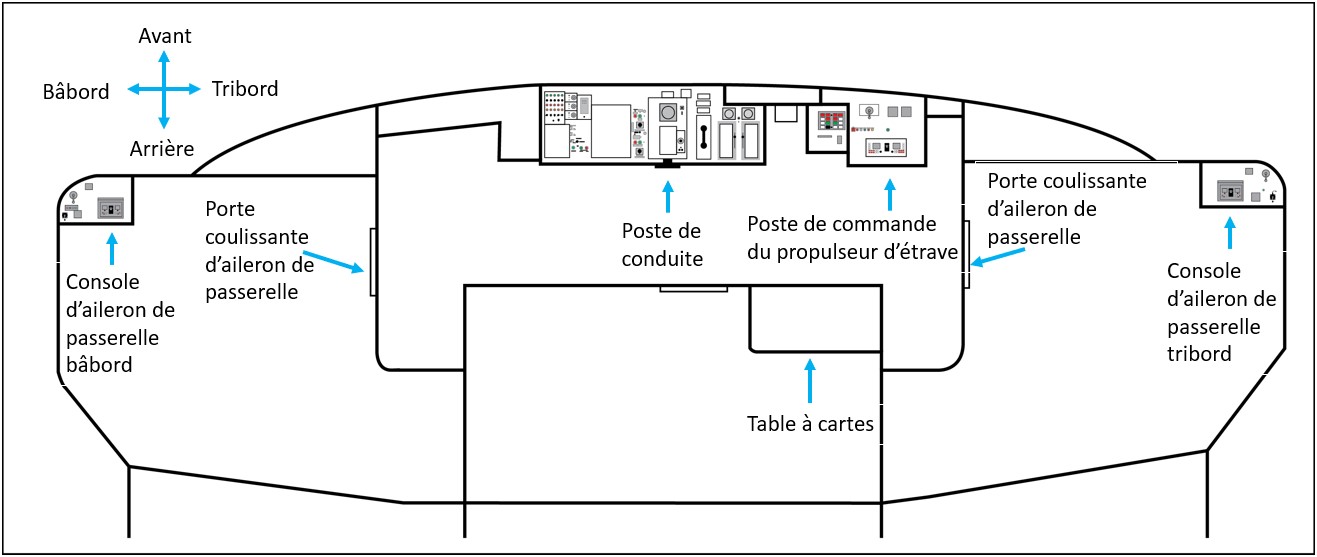 La passerelle était fermée et dotée d’équipement de navigation, dont un loch, un GPS (système de positionnement mondial), un système d’identification automatique et des radars de 3 cm et de 10 cm avec capacité d’aide au pointage radar automatique. Le navire avait aussi des cartes en papier et un système de cartes électroniques. Les consoles principales de commande de la direction et de la propulsion se trouvaient au milieu de la passerelle; d’autres consoles situées sur les ailerons de passerelle ouverts étaient employées pendant l’accostage. Le navire était muni d’un propulseur d’étrave dont les commandes se trouvaient sur la console de passerelle et sur les consoles d’aileron de passerelle bâbord et tribord (figure 2).